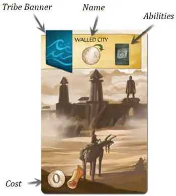 The player pays the cost in coins and knowledge to the supply and places the empire card to the right of their player board (in the bottom row of cards). Empire cards give bonuses and abilities, described in the sections "Card Abilities" on page 14.