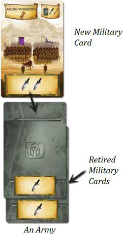 To retire a military card, the player removes all coins on the card, returning them to the supply, and flips it over so that the legacy abilities are showing. Legacy abilities represent skills that the old soldiers learned and taught to the new soldiers.