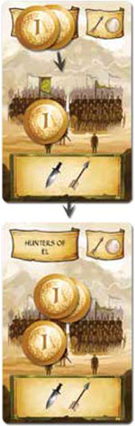 Put 1 coin on 1 army: Take one of your coins and place it on the picture section of one of your active military cards.