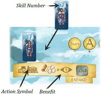 Each player collects coins, knowledge, and ambrosia for each coin, knowledge, and ambrosia symbol with a green arrow that they own on their player board and cards.