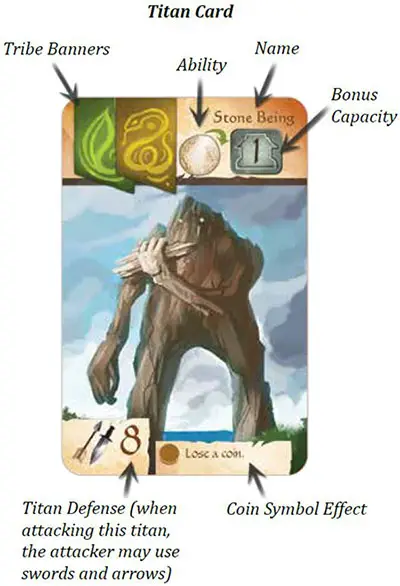 Titan cards grant abilities, tribe banners, and capacity when defeated. In story terms, this represents that when a city-state defeats a titan, more tribes flock to the capital, and new lands open up for development.