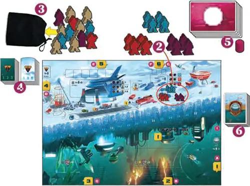 4 Gantry: Reveal Building tiles from the indicated stack (Ocean if you are about to play round 1, 2, or 3; Surface if you are about to play round 4, 5, or 6); equal to the number of players. Display them by the side of the board, adding to any that remain from the previous round.