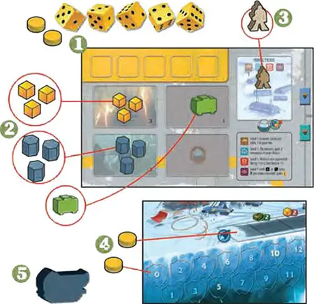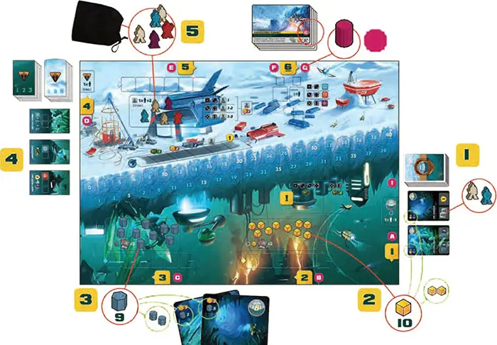Harvest resources (Energy and Minerals), construct buildings (in the ocean to improve your abilities and above the ice for scoring), gain and train colonists to staff your colony and help with expeditions.