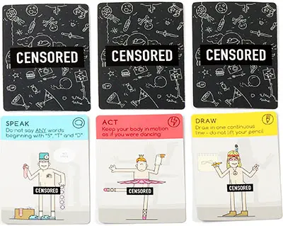 The performer now draws one CENSORED card and reads it aloud. This card directs the performer to DRAW, ACT, or SPEAK clues, and includes rules the performer must follow (e.g. must speak - using only ten words or less).