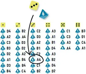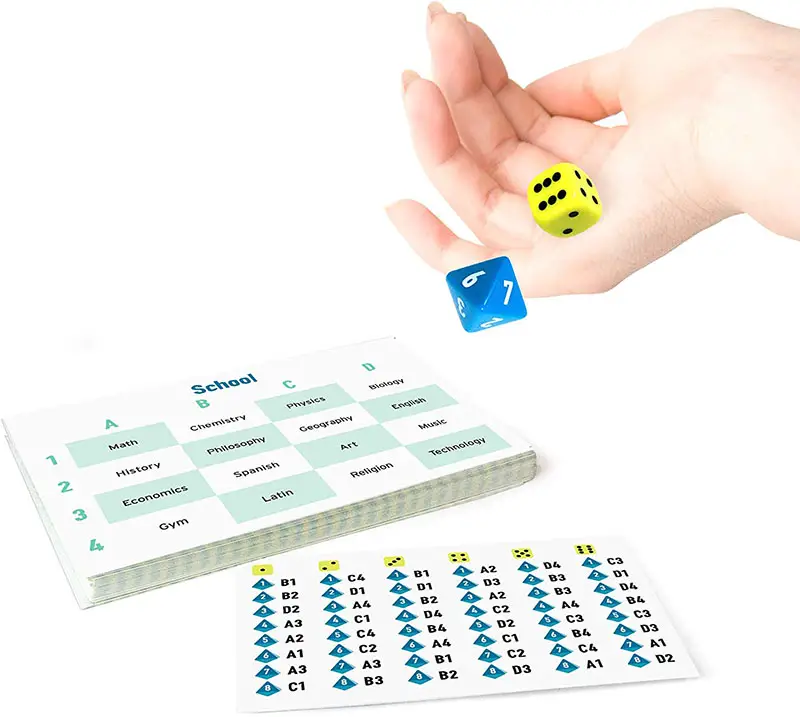 The dealer turns over a Topic Card for all to see and rolls the yellow and blue dice. The two numbers on the dice lead everyone (except the Chameleon) to a secret coordinate on their Code Card. This coordinate is then used to locate the secret word on the Topic Card in front of them.