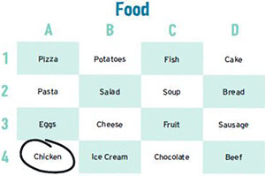 On your Code Card this roll points to A4. A4 on the Topic Card points to the secret word for the round - Chicken.