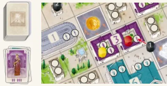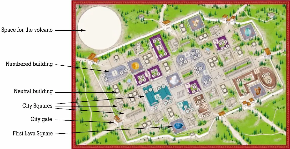 Note: The Pompeji game board is divided into squares. Some buildings are one square big (e.g. the building number 9); others stretch across two squares (e.g. building number 2). Therefore, it is important that you put the game pieces exactly on the small, round spaces within the buildings. No player may put game pieces into buildings without such spaces.
