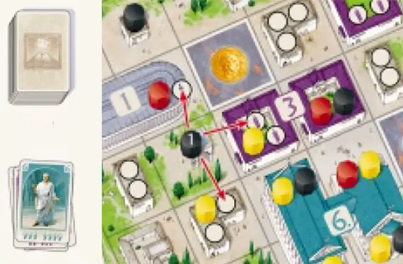 Example: Jurgen plays a grey card with the number 1.He puts one of his red pieces onto the grey building with the 'house number'1,then draws one card from the stock.
