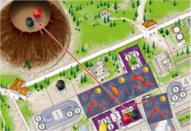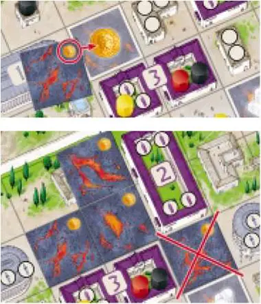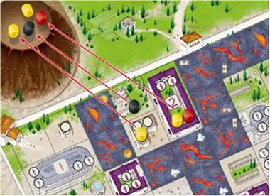 The other players follow clockwise,drawing and placing one lava tile each until there are six tiles on the board.If a player puts a lava tile onto a city square (regardless of whether it shows a whole building or only half a building) on which there are game pieces, these are thrown into the volcano.