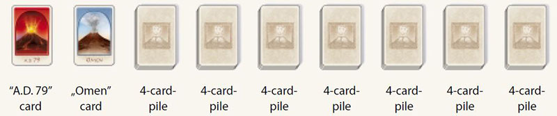 Then, he shuffles the "Omen"cards back into the pile of remaining Pompeji cards he still has in hand,and puts them next to the game board as one face-down pile. On top of this pile,also face-down, he puts the "A.D. 79" ca rd and,on top of that, any two of the 4-card-piles. Now you have the stock pile.