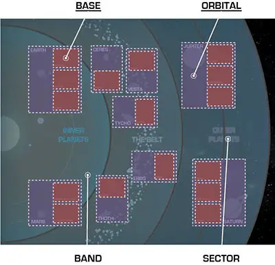 Bands: There are four Bands on the map, separated by the thick colored lines. Earth and Mars Orbitals are in the same Band, all the Belt Bases are in a Band, and Jupiter and Saturn each have their own Band. Bands are used to control Movement.