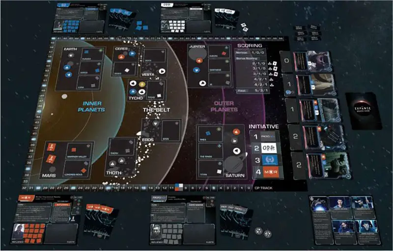 The Expanse is a game of politics, conquest, and intrigue for two to four players. Players spread their influence through the solar system onto important Bases using characters and events in the Expanse Universe, and must make clever use of their special faction abilities to gain an edge.
