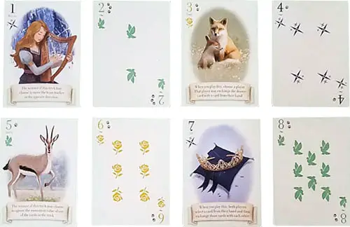 Based on the suits and ranks of the two played cards, one player will win the trick. Then the team tracker will move along the forest path toward the player who won the trick, based on the movement values of the two played cards.