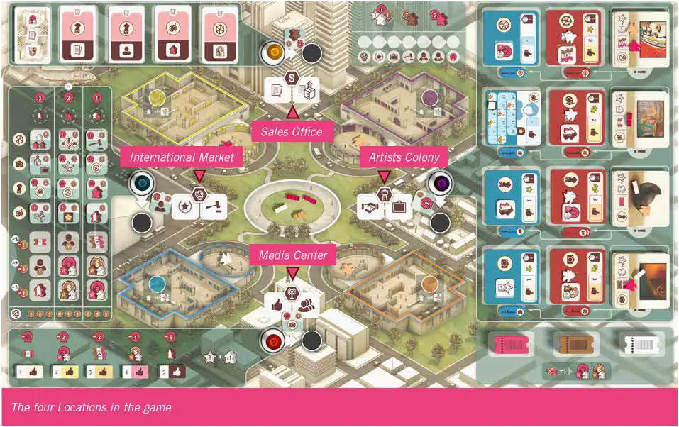 Media Center: A Player can hire extra Assistants at this Location, or promote an Artist in the media, which will increase their Fame as well as reward the Player an additional bonus.