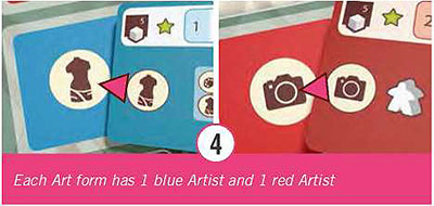 If you draw an Artist whose space is already occupied, return it to the game box. Repeat the process until all spaces are filled and then return any remaining Artists to the game box. There must be one blue and one red Artist for each Art form.