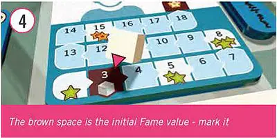 Place the first drawn blue Artist tile face-up, and mark its initial Fame with a white cube. Initial Fame value is printed on both sides of the tile.