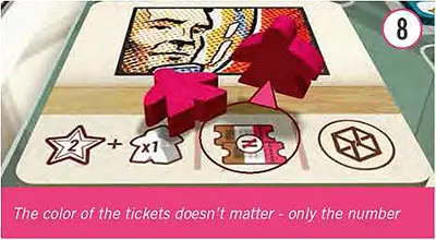 Example: Purple buys a Work of Art that gives 2 tickets of any color. She wants one white ticket and one brown ticket, but there are only 2 brown tickets in the box office. So, she takes one brown ticket as normal, and then discards another brown ticket from the box office and takes a white ticket from the discard pile.