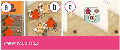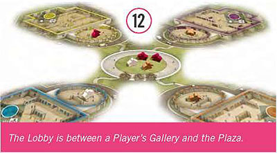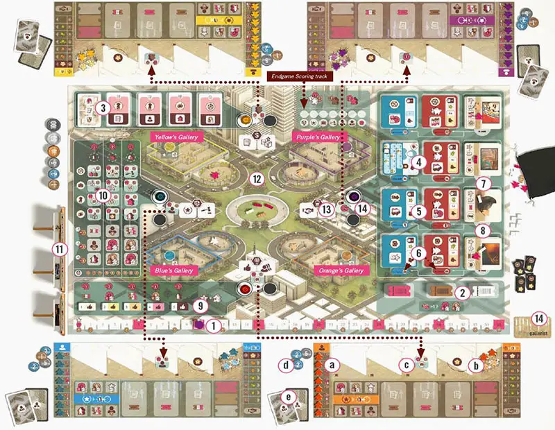 Place the Game board in the middle of the table. Place the Player boards around the Game board nearest to the Gallery of the appropriate color.