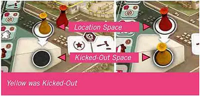 If a Player moves their Gallerist pawn to a Location where there is already another Gallerist pawn or Assistant, that piece is 'Kicked-Out' and moved to the black space in front of the Location space. After the active Player finishes their turn, the Player who was Kicked-Out may take a special 'Kicked-Out Action', and then the Gallerist pawn / Assistant returns home (see Going Home - bellow).
