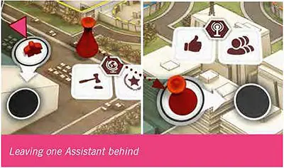 Example: It is Purple's turn. She moves to the Sales Office, where the Yellow Player has an Assistant. Yellow's Assistant is moved to the black space in front of the Location space.
