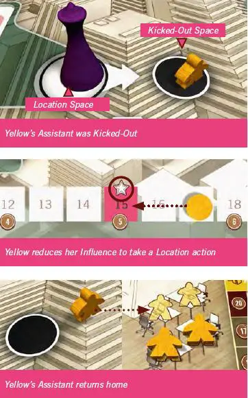 After Purple has performed her Location Action, Yellow may use her Kicked-Out Action to also perform the Location Action (moving her Influence marker back to the previous Fame icon). The Assistant returns home.