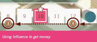 When a Player needs to spend money he may move his Influence disc back on the Influence track to the previous space that shows the money icon.