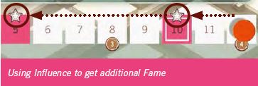 Example: Orange has 12 Influence and buys a Work of Art. The Artist would gain 2 Fame from this action, but Orange chooses to move his Influence disc back to space 10 (the previous Fame icon), and the Artist gains 1 additional Fame. If he moved the disc to space 5, the artist would gain 2 additional Fame.