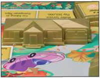 Buildings, Mountains & Bridge: Match the circled letters on the plastic buildings, mountains and bridge to the letters on the gameboard.