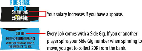 Payday! For each of these spaces you pass or land on, collect your salary from the bank. Remember to collect your increased salary if you have a spouse!