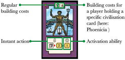 Important: The immediate effects (lightning sign) a card may provide must be applied directly after a card has been chosen and can only applied once even if a player keeps the card in the next Era. The permanent effects, however, stay in effect until the civilization card is discarded.