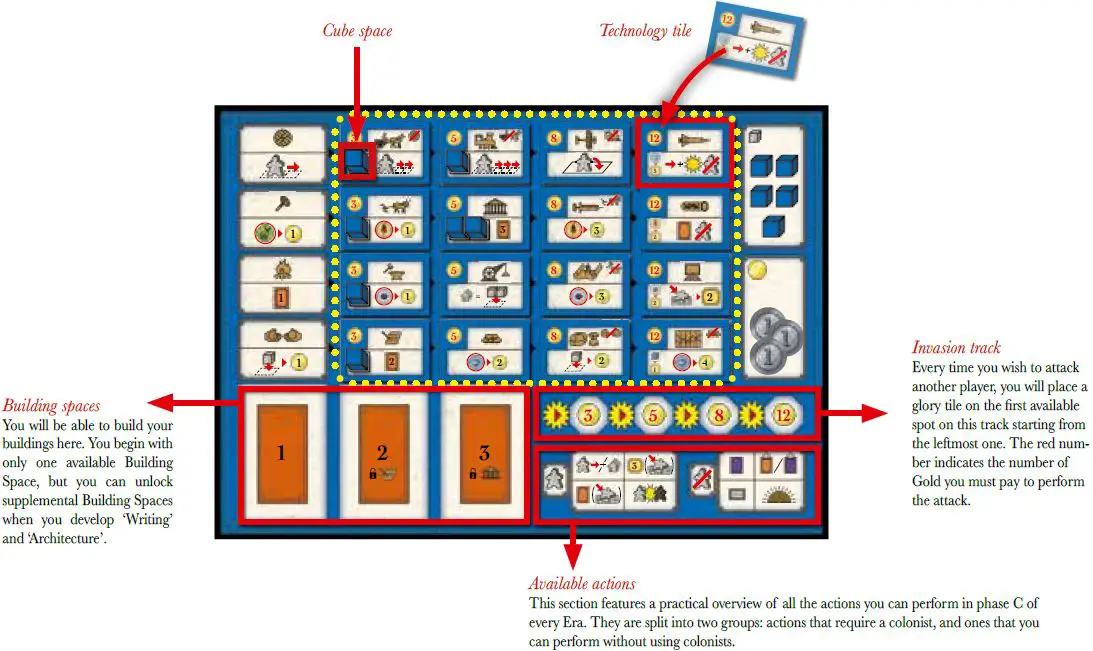 The Player Board is the center of your game experience. It will show you all the available technologies at your disposal, contains the building spaces, invasion track and an overview of the available actions.