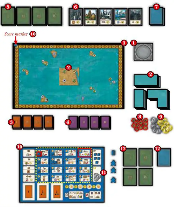 - The score marker is placed on space '0' of the score track on the game board.