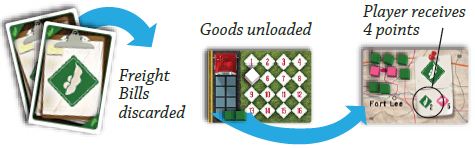 The discarded Freight Bills must match goods of the Cargo Cubes they have in their Freight Trailer and Cargo Cubes may only be Unloaded at Locations that have demand for the goods. Players collect the points indicated by the number on the goods icon for each Cargo Cube unloaded.