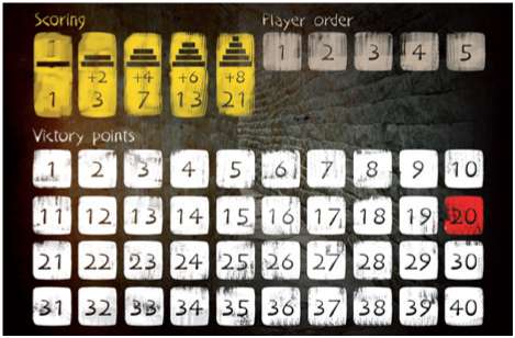 A player scores victory points for owning monuments and craftsmen. The current number of victory points can always be determined by counting the points of his buildings on the board, but it is easier to keep track of them on the victory points track. A wooden cube in each player color is used to show the current VP.