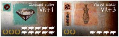 There are 7 types of craftsmen, which can be placed on the board. There are four primary craftsmen: potters, ivory carvers, wood carvers and diamond cutters. There are also three secondary craftsmen: vessel makers, throne makers, and sculptors.