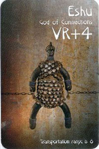The player adoring Eshu has a transportation range of 6 instead of 3. Note that all craftsmen on the board have range 6, increasing the number of map resources available to craftsman.