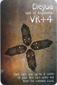 In each generosity of the kings phase, the player who adores Elegua may pay up to three cattle for his first gift from the common stock instead of paying them from his own stock.