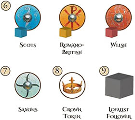 Each faction has a home region containing their faction symbol: Caledonia for the Scots, Caerleon for the Welsh and Londinium for the Romano-British. Place 2 Followers of the matching color in each home region and place the rest in the draw bag.