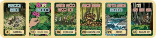 The core of the game is the adventure cards. Each one represents an encounter in the jungle. To succeed you'll have to make sure these encounters happen in an order which the explorers can survive. Sometimes the cards will be obviously positive or negative, but usually they will be a mix of both. Each card has a name and a number (on the bottom), and a series of caption boxes (near the top).