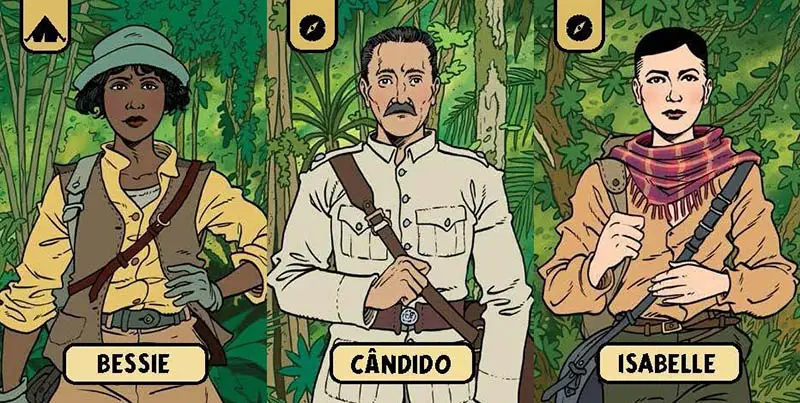 Before you set the game up, quickly run through the deck of adventure cards and remove any card with an exclamation mark in the title. There are six of these cards: 1, 8, 17, 33, 41, and 52. Set up two team areas, and choose a pawn each. Each player should take one explorer of each Expertise, three Ammunition tokens and three Food tokens for their team area. Place four Health tokens on each explorer.