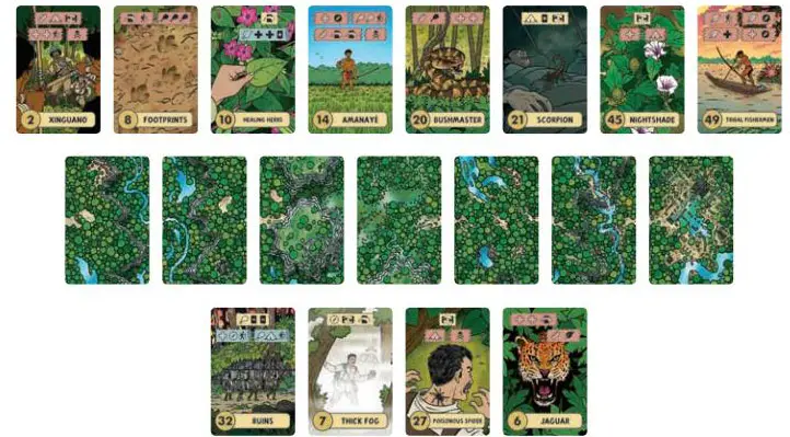 Lay out seven expedition cards in the centre of the table, ending in the lost city, and place both pawns on the first expedition card. Shuffle the adventure cards and deal six to each player. Flip the leader token to decide who will be the first expedition leader.