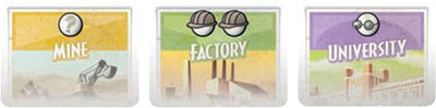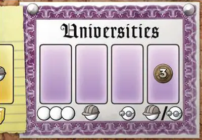 University spaces produce Workers: When you place Workers on one of the purple University spaces, you receive the Workers shown. The left space produces three Laborers. The second space produces one Engineer.
