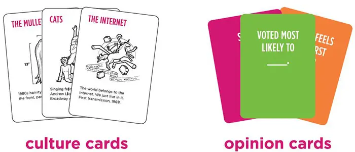 Each player reads their opinion card out loud. If yours has a blank: as you read the card, you make up a word or phrase to fill the blank. Then everyone puts ALL of their culture cards face-down next to the opinion cards of other players to make good matches.