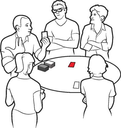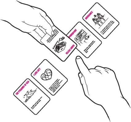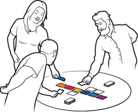 The critic starts placing opinion cards face-up in a column. Meanwhile, the other players draw a single card at a time with their free hand and play it face- down next to an opinion card, on their side of the column.