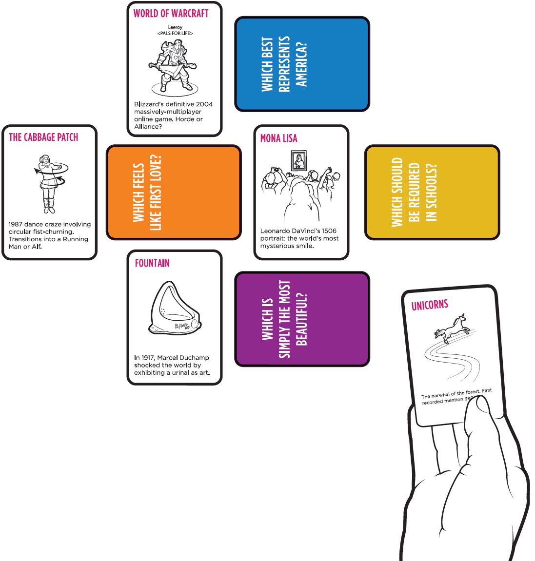 It's got strategy. It's got debate. And it turns your tabletop into a crazy-quilt of culture. Lose all your cards to win.