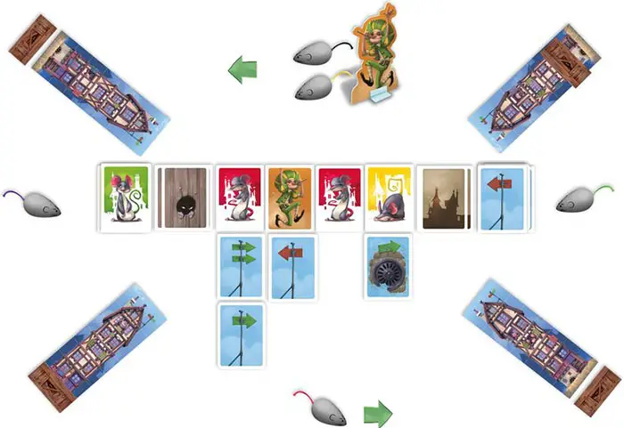 Place a rat figurine between each house. Then, to the left of the start player, add a second rat figurine and the Pied Piper figurine. Point the figurines to the right, as shown in the diagram.