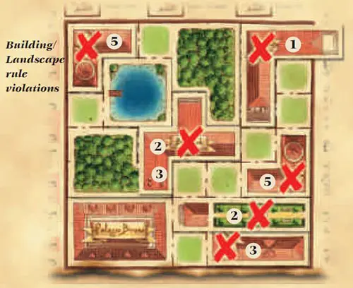 The player may not place a Building (or a Landscape) so that it overlaps, even partially, another Building or a Landscape.