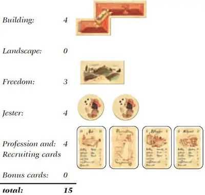 The player calculates the WV points based on how the objects in his Principality match those desired by the artist or scholar as described on the Profession card played. The WV starts at 0 and: