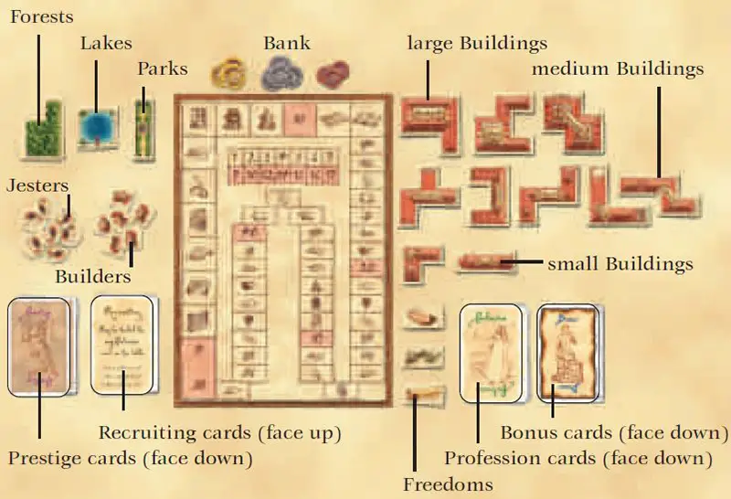 Central to the Auction phase are the 7 stacks with the different "objects" that are to the left of the game board: Forests, Lakes, Parks, Jesters, Builders, Prestige cards, and Recruiting cards. The different objects give the players who have them specific advantages throughout the game.