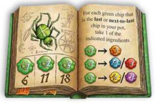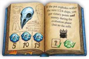 Bonus: When you place a blue 1-chip in your pot, if your potion explodes with the next drawn chip then you receive both victory points and coins for shopping. However, you still cannot roll the Bonus Die if your potion explodes.